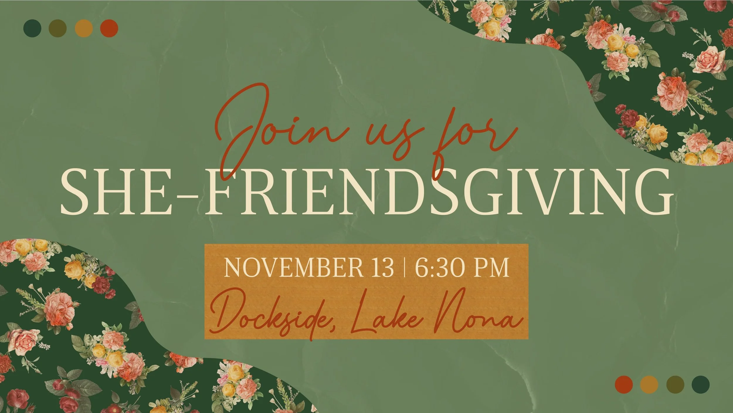 SHE Sisters, join us for a beautiful evening of friendship, conversation, encouragement, gratitude, and fun giveaways at our annual SHE Friendsgiving.